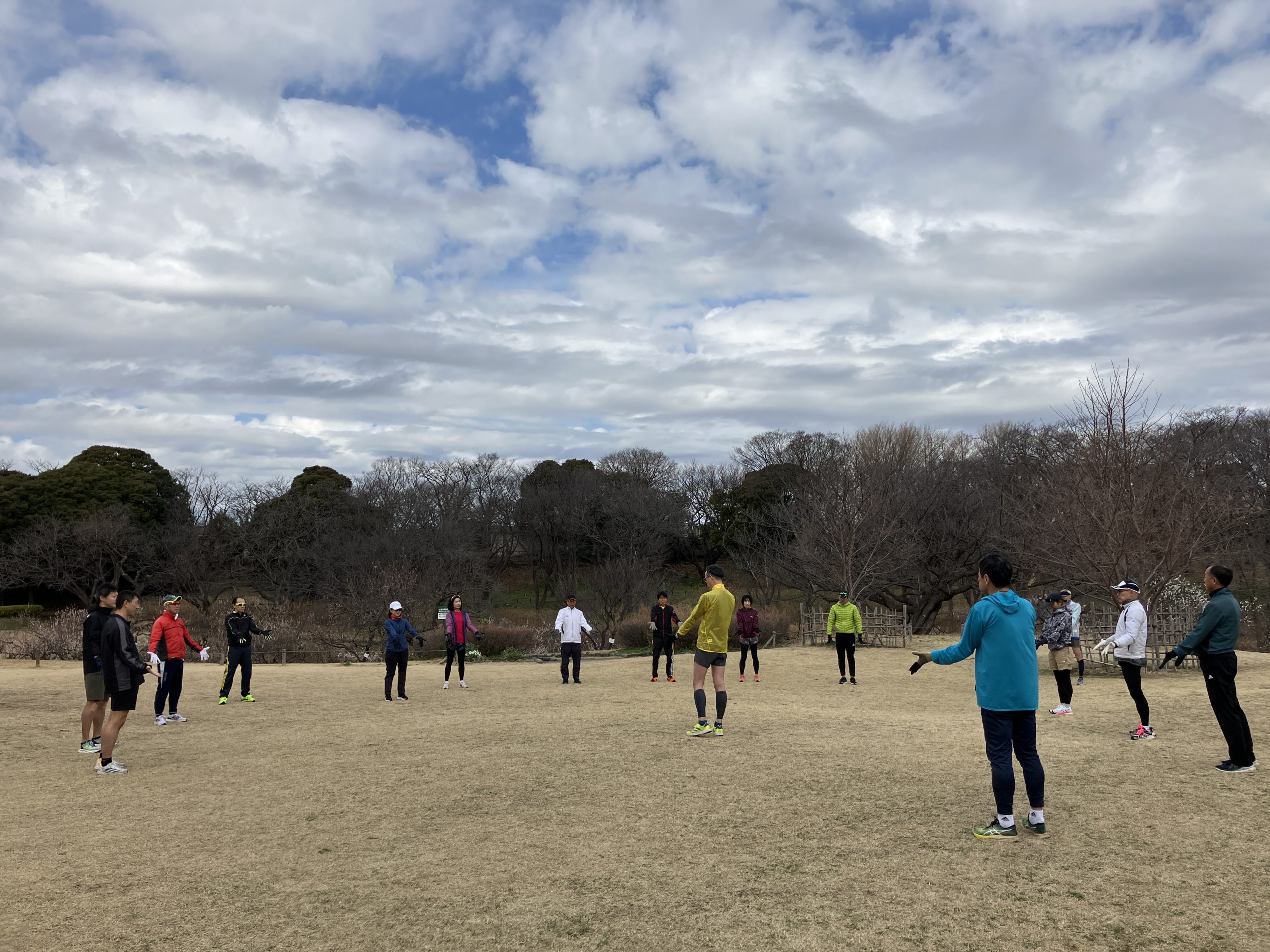 参加者は、20数名程度、恒例の集合写真の後 オープニングジョグ、平野さんリードによる動的ストレッチを行いました。