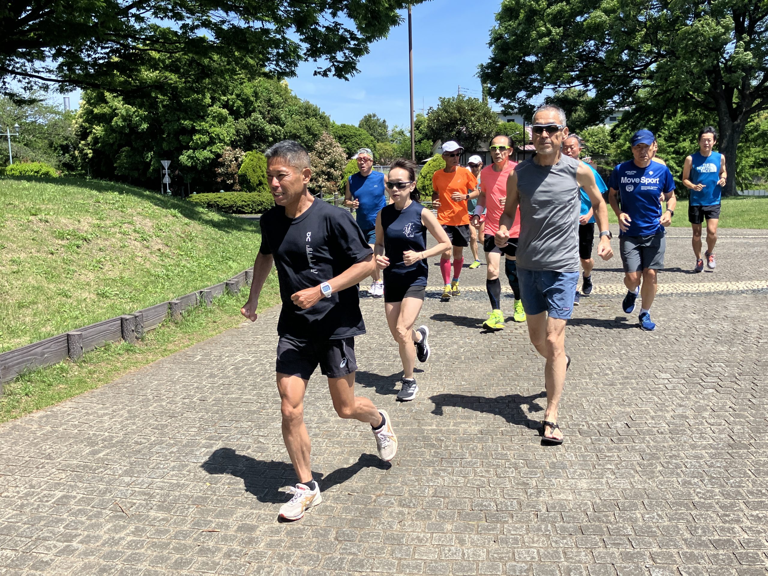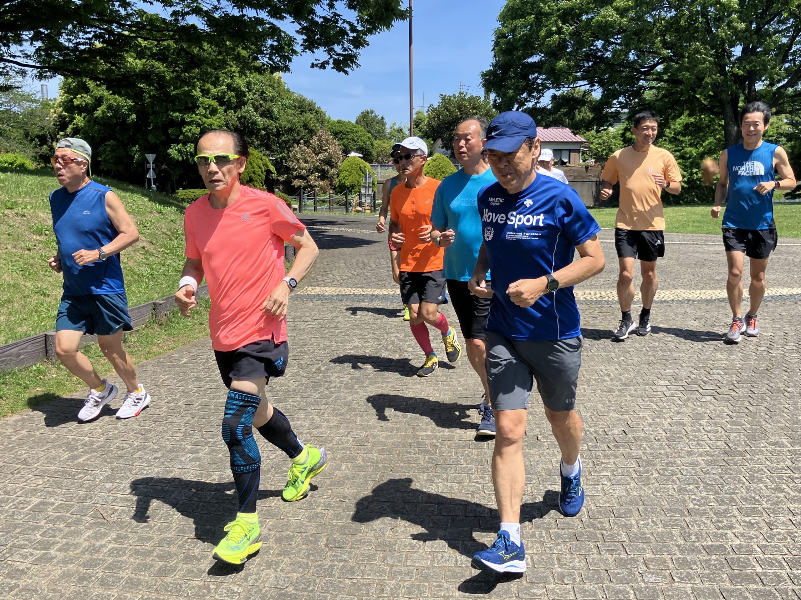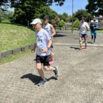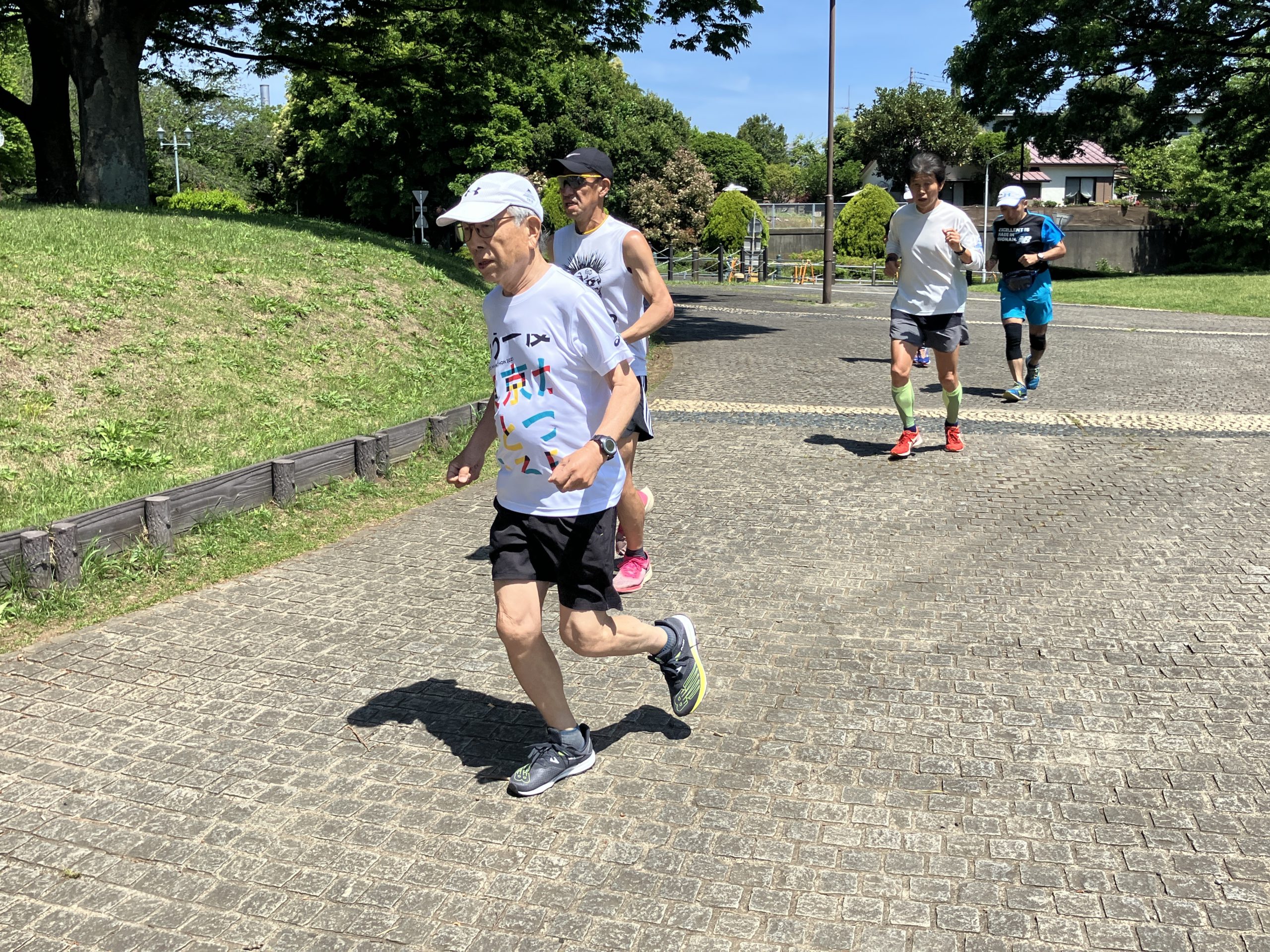 加藤さんのオープニングストレッチに始まり、その後園内走と1キロ×7本のインターバル組に分かれ練習開始。