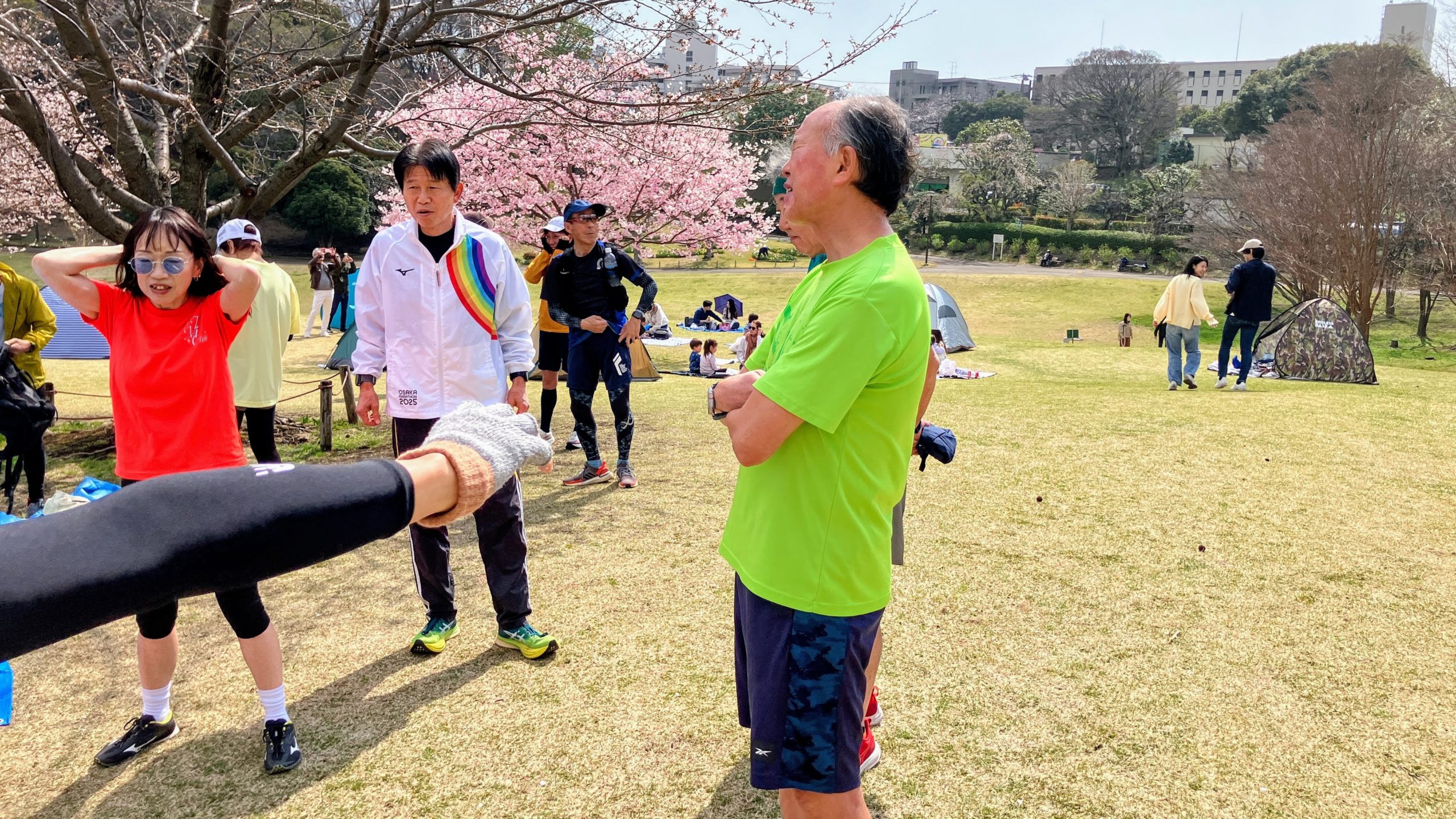 参加者は12人前後。今回の練習は園外走で、練習後に“花見の練習”を行うということで、ベースキャンプはOB・OGの皆様とご一緒させて頂きました。