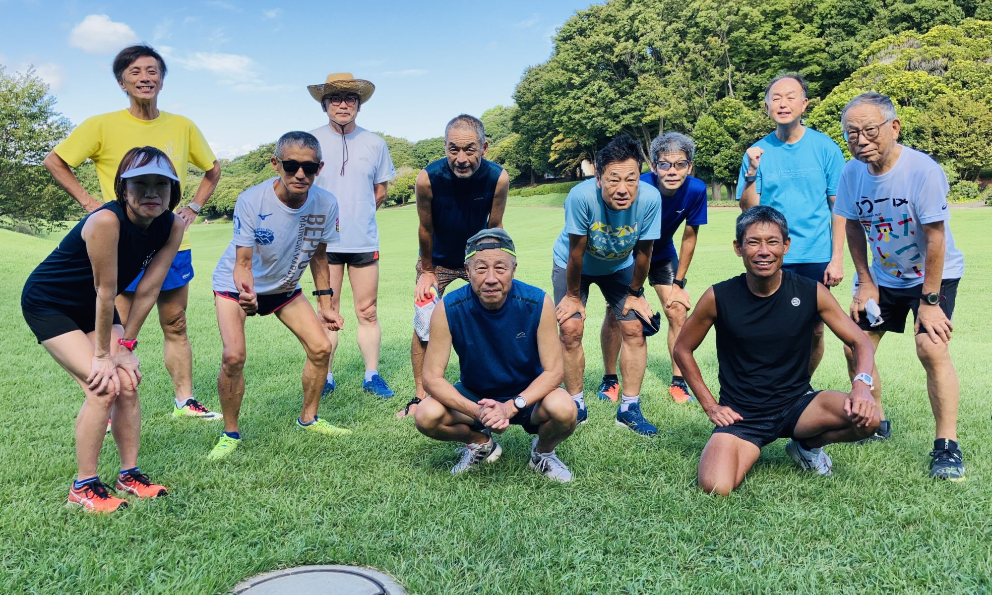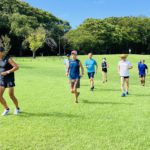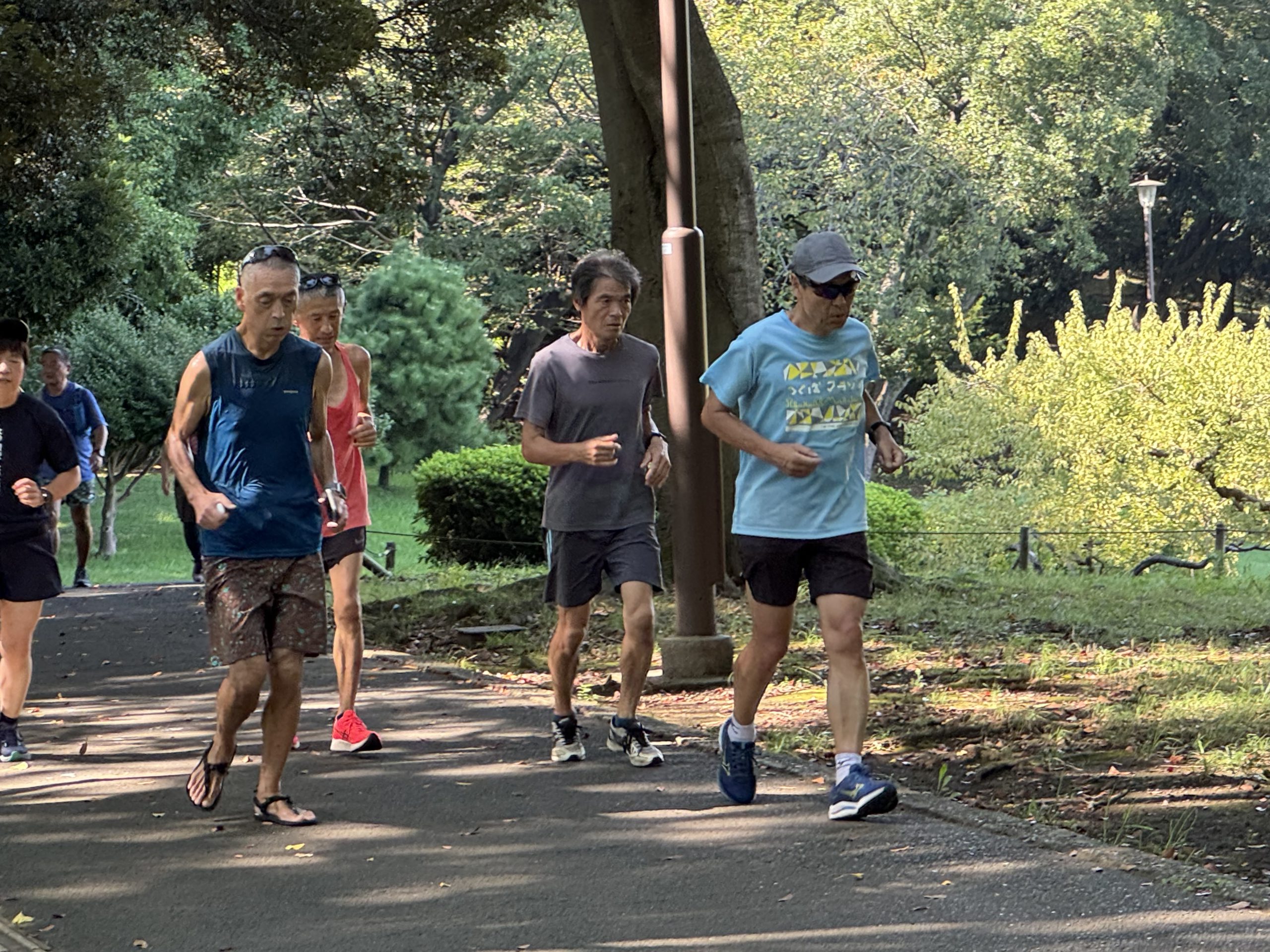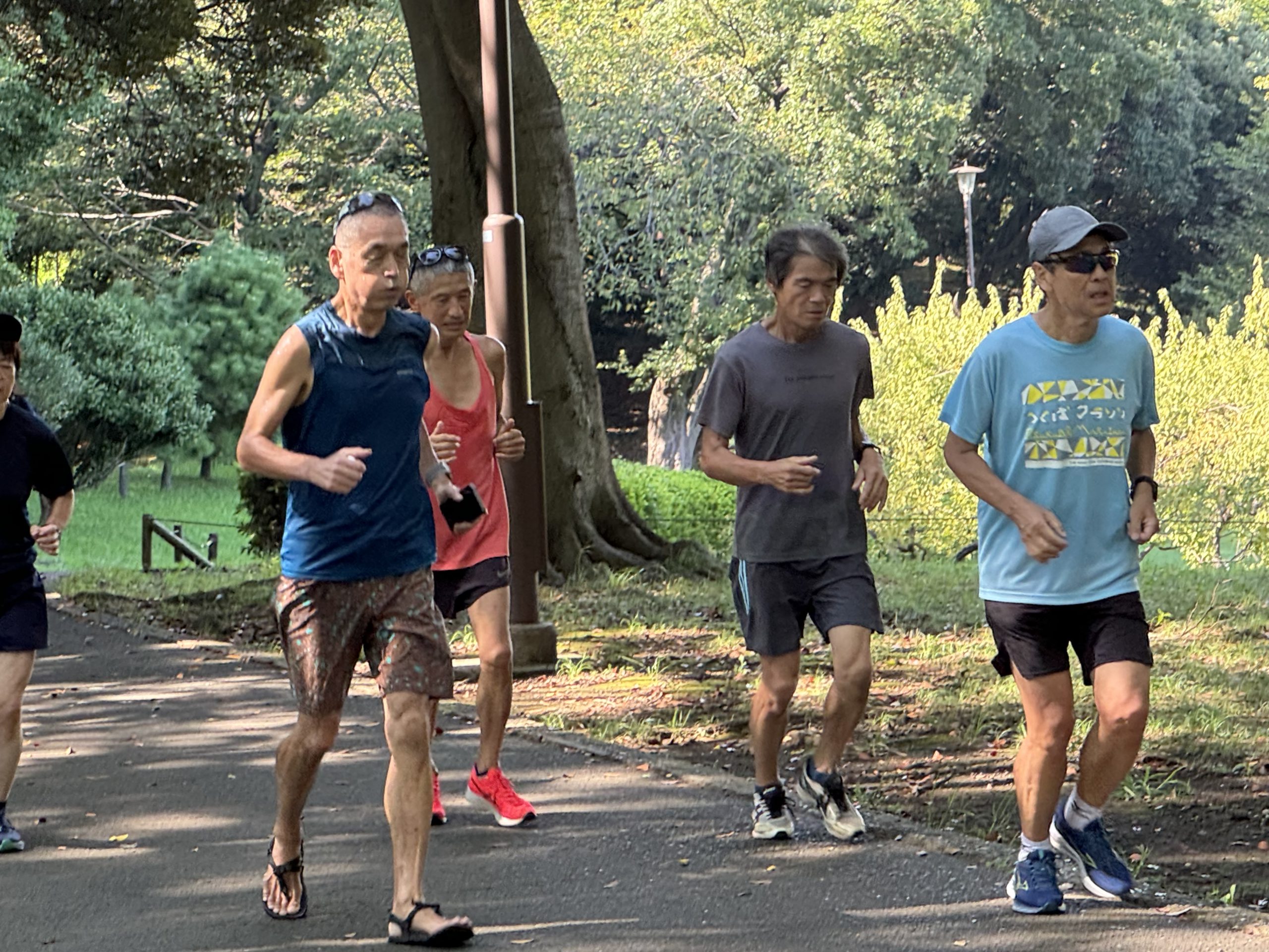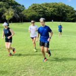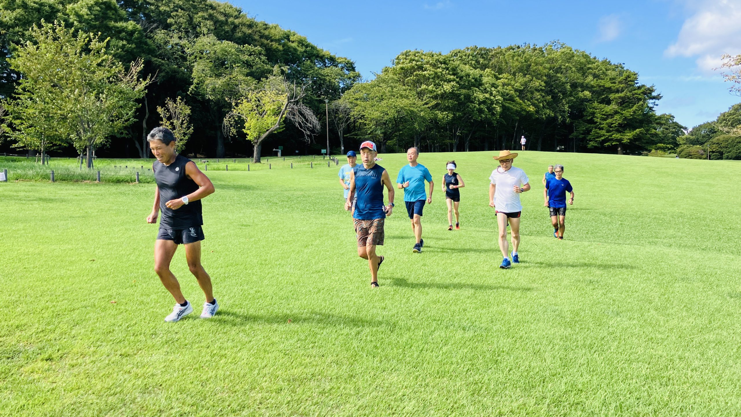 オープニングジョグの後、加藤さんのリードで準備運動、ショートインターバル(200×20本)、その後芝生(100×10本)暑い中やり切ることができました。インターバル終了後、園内を日陰中心にゆっくり走り、加藤さんのリードで簡単なアフターストレッチで終了しました。