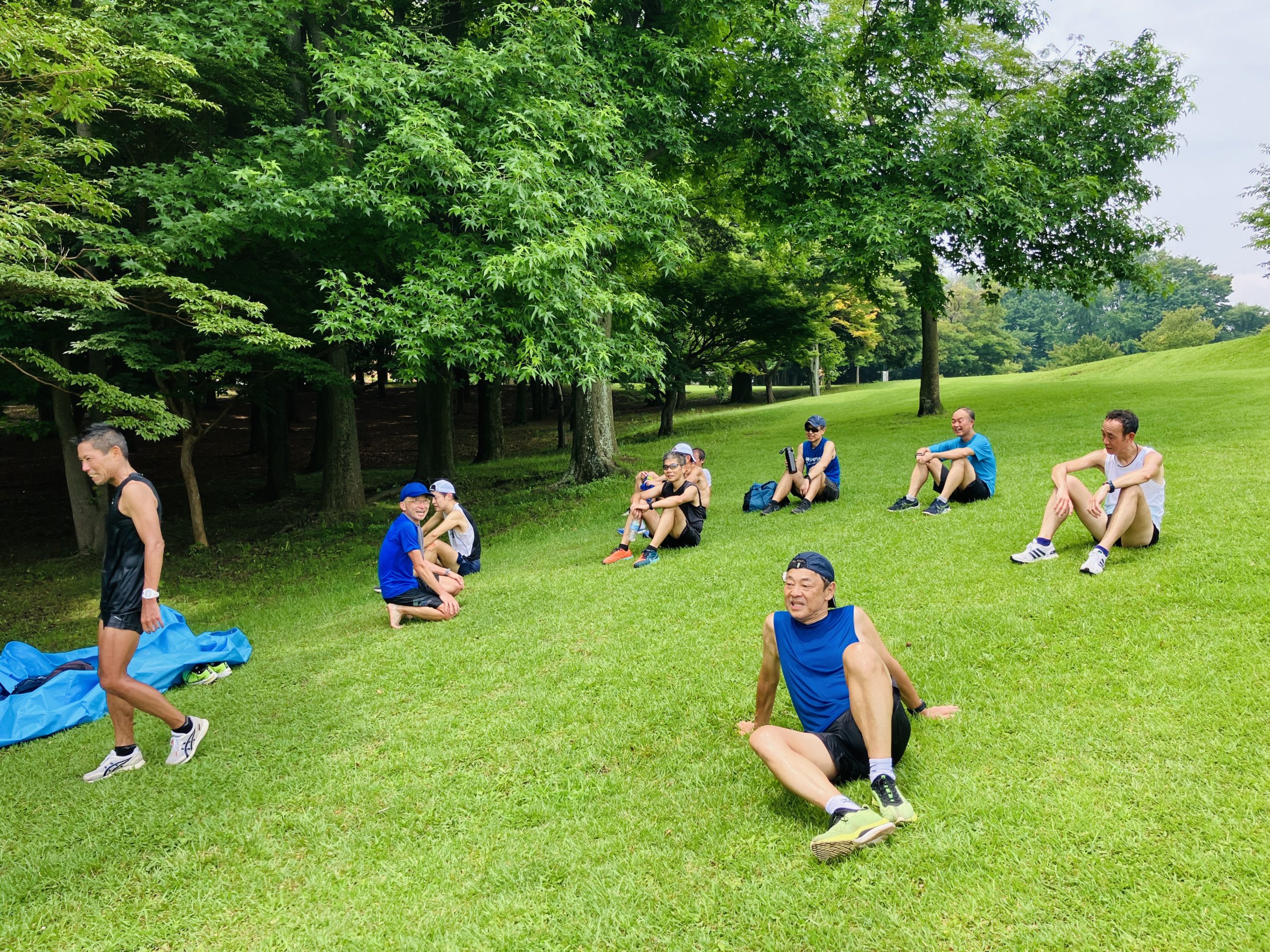 この日も芝生エリア、周回エリア共に一般公園利用者が少なかったため、1セット目は日蔭になっている周回コースの一部を使って200m×10本。