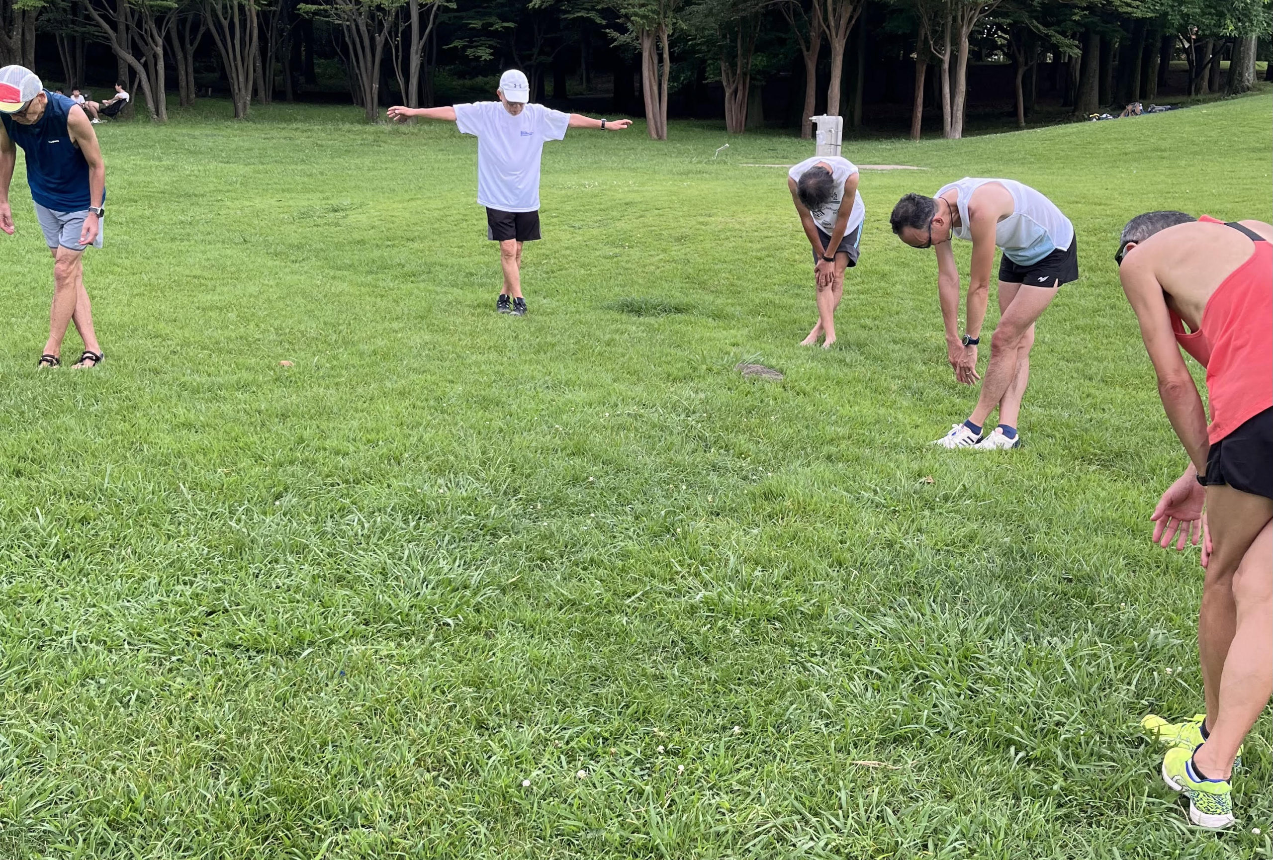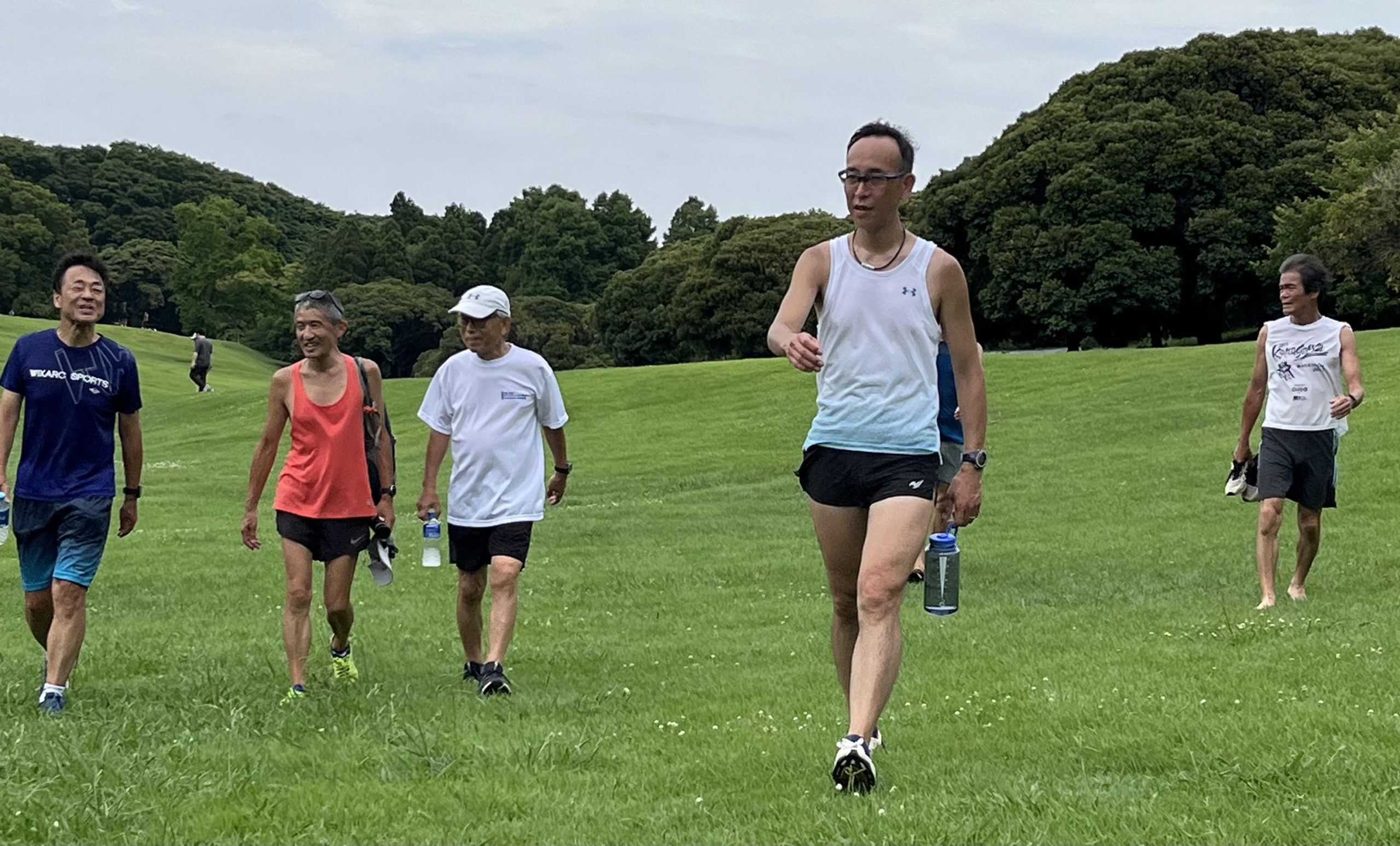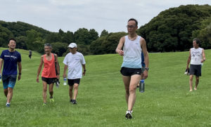 オープニングジョグとは一転して 杉の木に向かう登りの芝生は、曇ってきたとはいえ蒸し暑く、最初の10本はメンバーについていくのがやっとでした。休憩後の後半10本では、体が少し慣れましたが、へとへとでした。