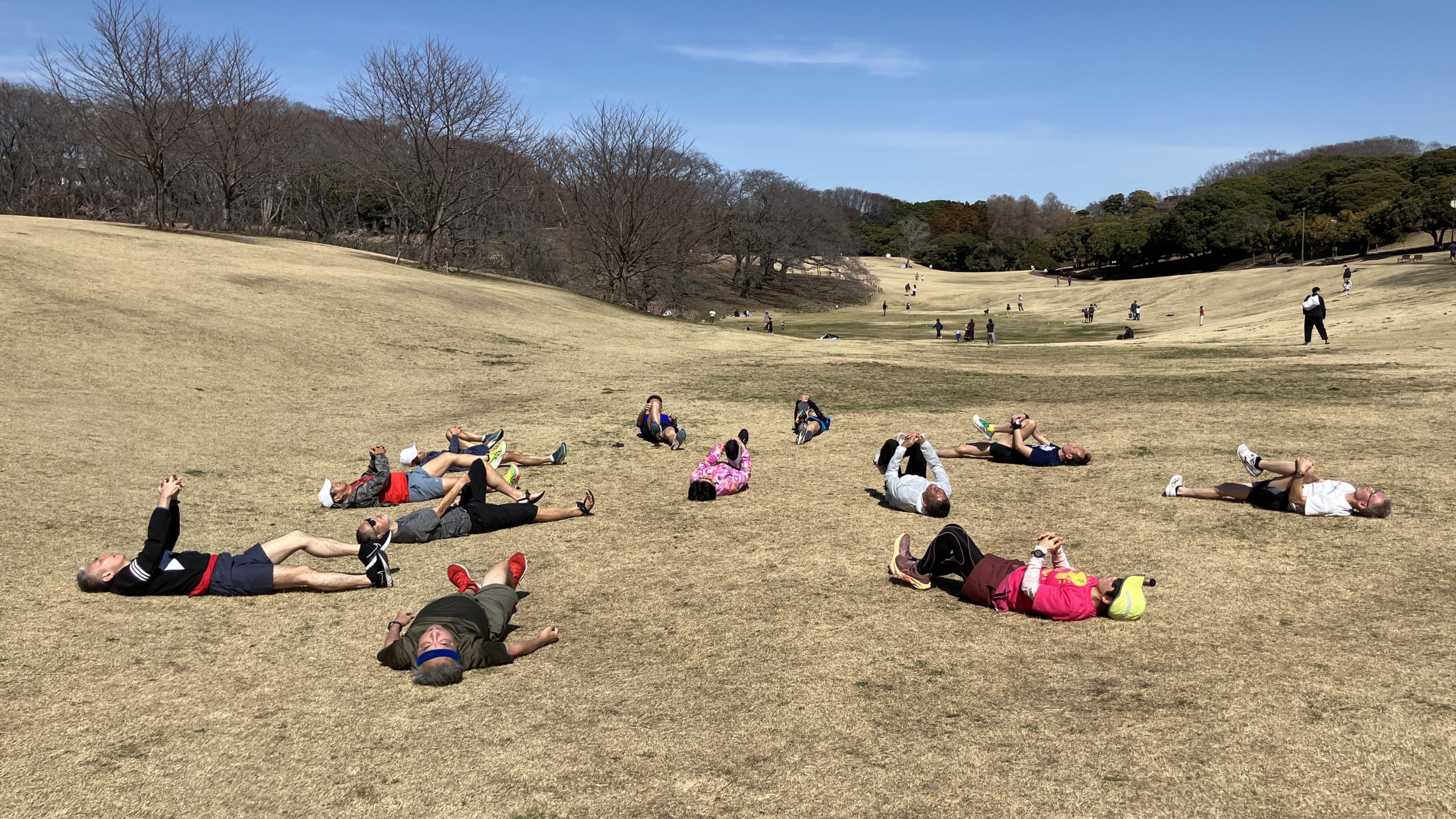 クロージングの辻さんのストレッチで体を伸ばしました。今日もウエアにたくさん芝生をつけて帰って妻にブツクサ言われたけど気にしてません。