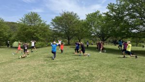 オープニングは加藤リーダーの“鉄板”動的ストレッチ。